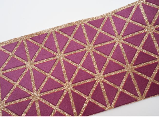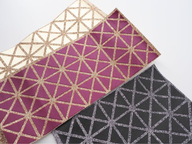 ラメ感のあるグリッターに、シルクスクリーン捺染で柄を表現しました。