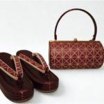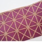 光沢のあるエナメル生地に、ゴールドの捺染加工を施し、草履とバッグへ製品化した事例です。艶やかなベースに金彩の柄が映え、華やかで立体感のある仕上がりを実現しています。エナメル素材ならではの発色性とメンテナンス性に加え、シルクスクリーンによる加飾で高い意匠性を付与。和装小物やフォーマル用途など、装飾性が求められる製品にも対応可能です。