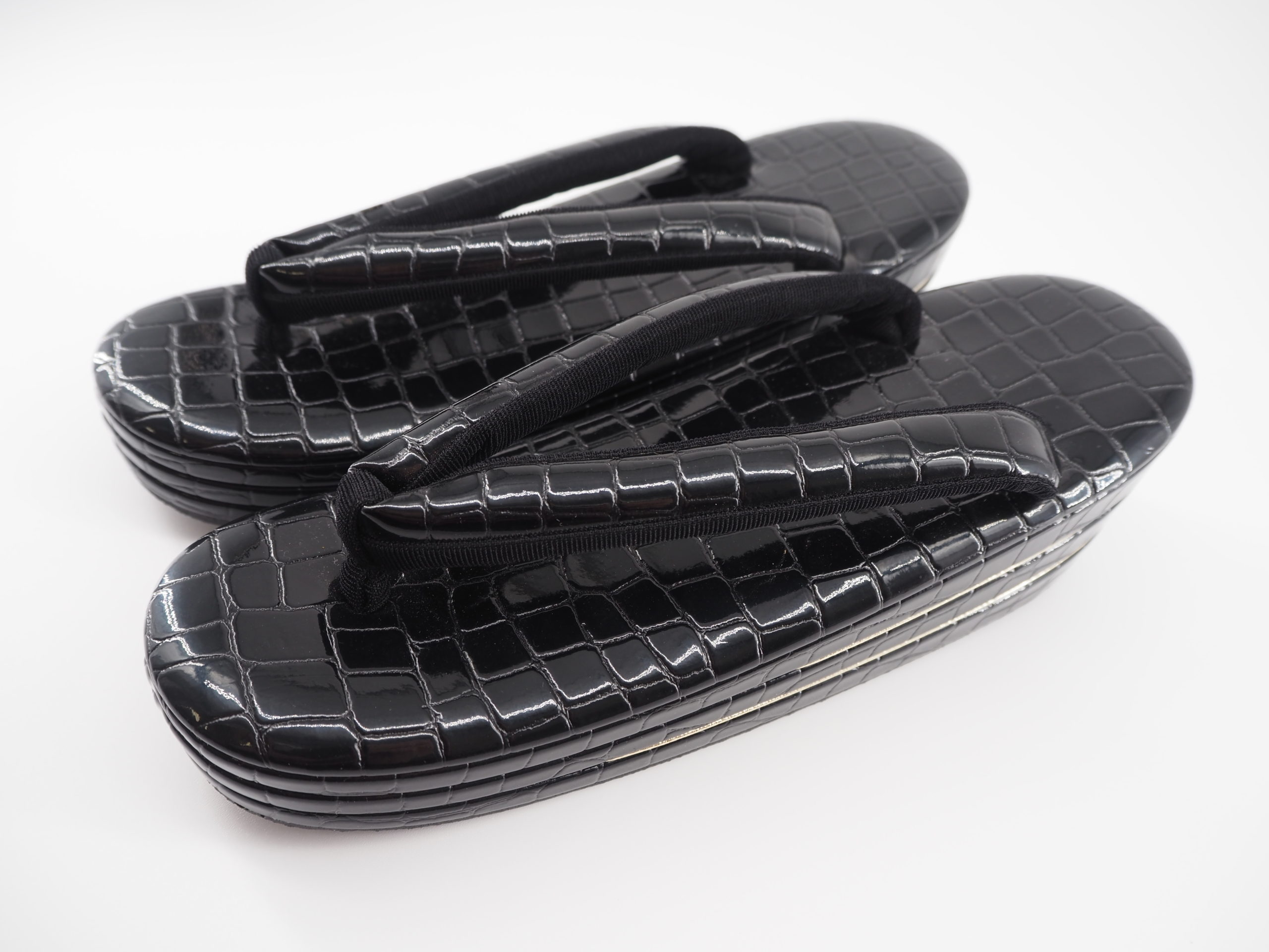艶のあるエナメル生地にクロコダイル調の型押しを施した、存在感のある草履です。立体的な凹凸と深い光沢が足元にシャープな印象を与え、装いを引き締めます。表面はなめらかで汚れが付きにくく、日常のお手入れも簡単。伝統的な和装に合わせやすい一足でありながら、モダンなコーディネートにも自然になじむデザインです。