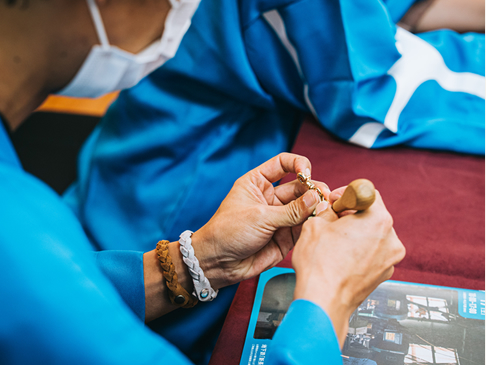 御守り制作では、当社の廃材を一部活用し、くつのまち・長田にゆかりのある同業者や加工会社の皆さまにもご協力をお願いしました。廃材の提供や加工など、それぞれの専門性を活かした形で支援いただき、地域のつながりを大切にした取り組みとして実施しています。