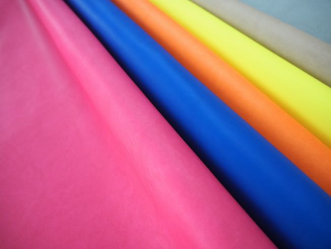 起毛ベースによるやわらかな表面感と、艶を抑えたマットな質感が特長のアッパー用合成皮革です。落ち着いた手触りと、光を反射しにくい表情により、素材感を活かした仕上がりが得られます。定番色に加え、蛍光色を展開している点が特長で、マット調素材としては珍しい、印象的なカラー表現が可能です。シューズアッパーのほか、ベルトやバッグなどの服飾雑貨にも採用実績があり、色や質感をアクセントとして活かした用途に適した素材です。