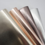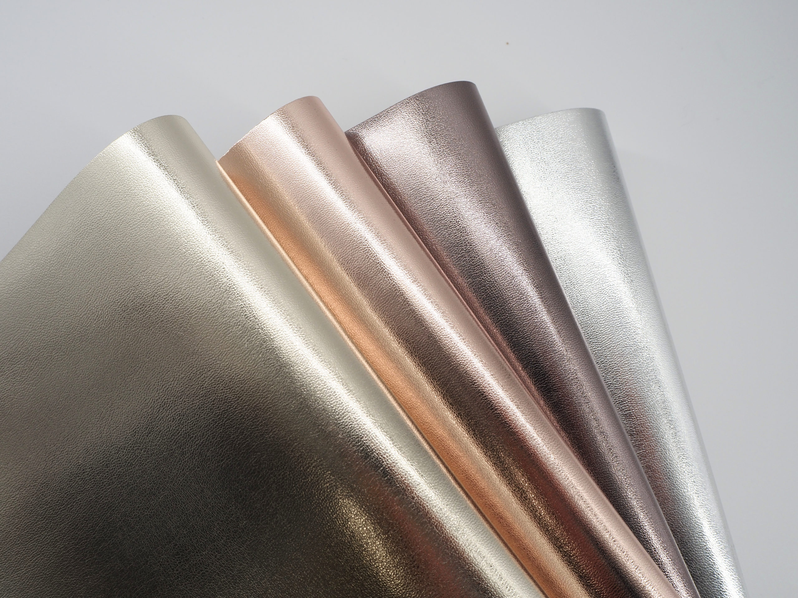 表面にアルミ箔を使用した合成皮革です。絞加工により、反射を程よく抑えつつ質感と立体感を付与。フラットなメタリック素材とは異なる、落ち着いた表情が特長です。シャープな印象と存在感を両立し、工業的なデザインやモード系の制作に適したマテリアルとして幅広く活用できます。